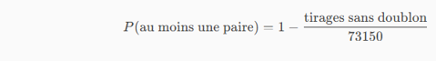 Il est souvent plus simple de calculer la probabilité complémentaire : celle de ne pas avoir de cartes identiques, puis de la soustraire de 1.