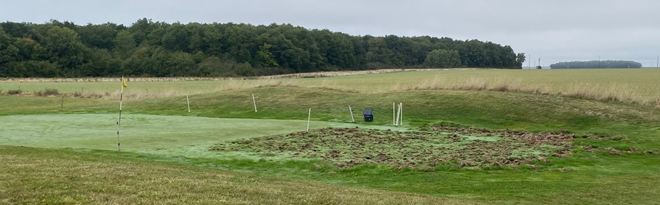Arrivés au trou numéro 8, le paysage change. Nous découvrons les dégâts laissés par une horde de sangliers : le green est ceinturé dune clôture électrique, ultime rempart contre ces visiteurs nocturnes. Le golf, décidément, réserve toujours son lot de surprises.